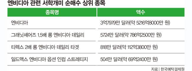 6월 1~12일 국내 개인투자자가 순매수한 엔비디아 주식 규모다(한국예탁결제원). 이 기간 전체 미국 주식 투자금(5억4518만 달러·약 7488억6000만 원)의 70%에 달하는 비중으로, 가장 많이 매수한 단일 종목이기도 하다. 개인투자자가 엔비디아를 이처럼 대량 매수한 배경엔 6월 10일(현지 시간) 거래부터 적용된 엔비디아 주식 액면분할이 있다. 엔비디아는 최근 기존 주식 1주를 10주로 쪼개는 액면분할을 단행했다. 통상 액면분할은 주가에 호재로 작용하기에 추가 상승 기대감이 서학개미 투심을 자극한 것이다.
