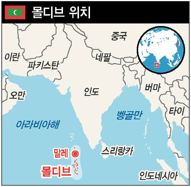 몰디브는 외부 세계에 오래전부터 알려져 있었다. 14세기 북아프리카 출신 여행자 이븐바투타의 여행기에도 나온다. 위치는 스리랑카와 인도의 남서쪽에 있으며 아시아 대륙 본토에서 약 750㎞ 떨어져 있다. 적도를 가로질러 26개 환초가 뻗어 있고, 그 환초들을 중심으로 1200개 가까운 산호섬들로 구성돼 있다. 면적 기준으로는 세계에서 아홉번째로 작은 국가이고 아시아에서는 가장 작은 나라다. 평균 해발고도가 1.5m밖에 안 되고 가장 높은 곳도 2.4m에 불과한, 세계에서 가장 고도가 낮은 나라이기도 하다.