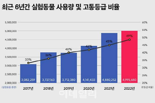 최근 통계인 지난 2022년 한국에서 E등급 실험에 사용된 실험동물은 242만 3155마리로 전체에서 49%를 차지하고 있습니다.