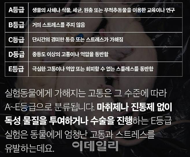 동물실험은 고통의 수준에 따라 크게 5가지 등급(A~E)으로 분류하고 있습니다.