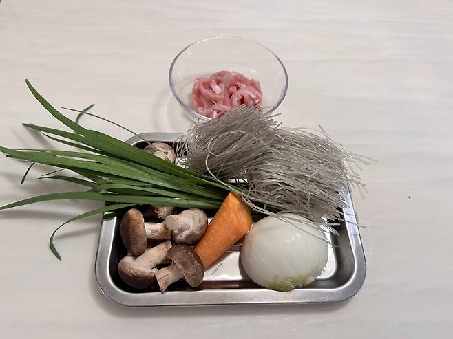 ▶재료: 당면 125g, 돼지고기 안심 100g(잡채용), 양파 반개, 당근 1/3조각, 버섯 6개, 부추 한 줌, 진간장 4큰술, 소금 1t, 굴소스 1큰술, 후추, 알룰로스 또는 물엿 1큰술, 참기름