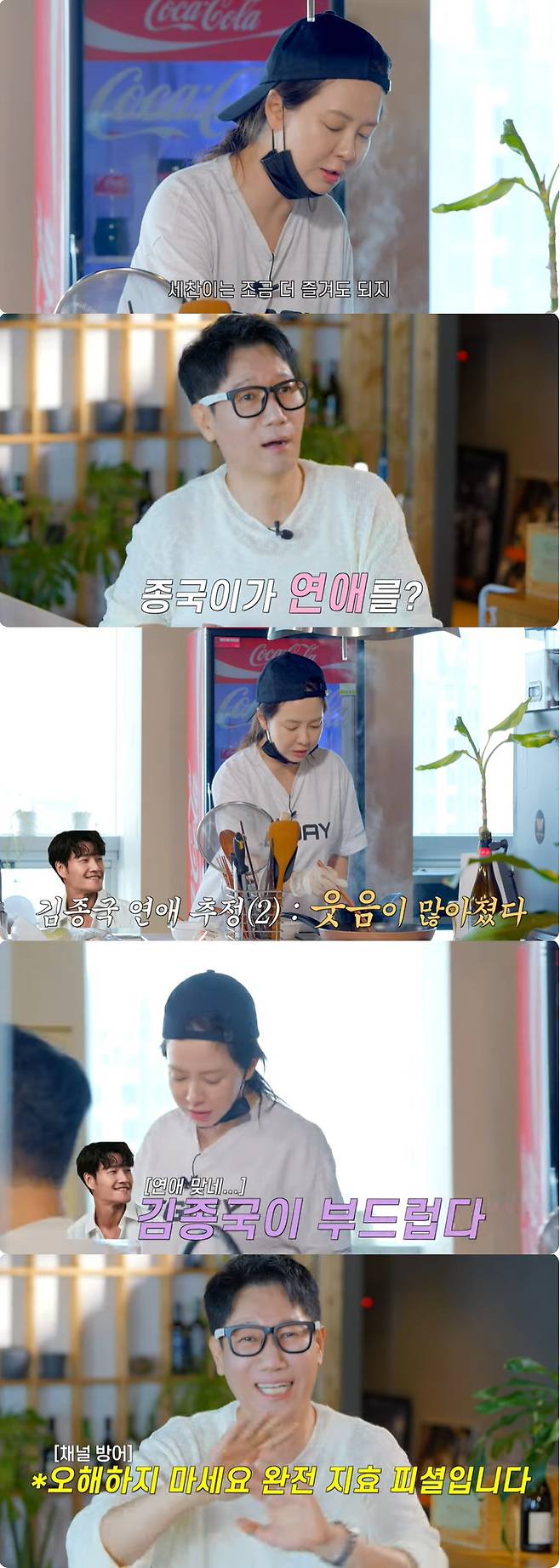지석진은 "왜 그런 생각을 했냐"고 물었고 송지효는 "오빠 요즘 화가 많이 줄었고 요즘 웃음이 많아졌다"고 추측의 이유를 밝혔다. 이에 지석진도 "엄청 웃더라. 그렇게 깔깔거리고 웃는 애가 아닌데"라고 인정했다. 송지효는 "종국 오빠가 요즘 많이 유해졌다. 아닌가? 내 느낌"이라 덧붙였고 지석진은 "가끔 통화해보면 헬스장 아니면 집에 있던데"라고 의심했다.