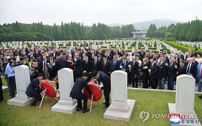 (평양 조선중앙통신=연합뉴스) 최홍희 전 국제태권도연맹(ITF) 총재 사망 22주년 추모행사가 15일 북한 신미리애국열사릉에서 진행됐다고 조선중앙통신이 16일 전했다.추모행사에는 국제태권도연맹, 국제무도경기위원회 집행위원들, 민족협회 대표들 및 여러 나라의 태권도인들과 무도 관계자들이 참석했다. 2024.6.16