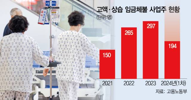 문제는 해마다 2번 공개되는 고액·상습 체불 사업주가 증가세를 보이고 있다는 점이다. 올 1차 명단에 194명이 포함되면서 지난해(297명)의 약 65%를 기록했다. 또 2021년 기록한 150명도 이미 넘어섰다. 올 1분기 체불금액은 5718억원으로 지난해 같은 기간과 비교해 50%가량 늘었다. 현재 추세대로라면 작년(1조7845억원)에 이어 올해 다시 체불액이 역대 최고치를 갈아치울 가능성이 높다. 실제 보건업·사회복지 서비스업 부분 사업주 가운데 고액의 임금 등을 상습적으로 체불했다가 명단에 오른 이는 직전 공개(2023년 2차·2014년 1월 4일 공개) 때만 해도 7명이었다. 하지만 5개월 만에 11명을 기록, 57.14%나 늘었다. 고액 체불 사업주 상위 20명 가운데서도 병원 사업주(의료 재단 포함) 3명이 포함됐다. 2023년 2차 명단 공개 때 상위 20명 중 4명이 병원 사업주였다.