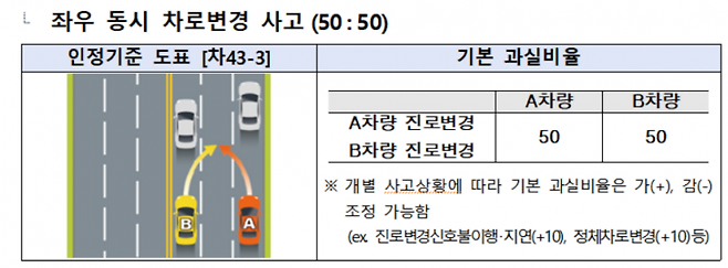 동일방향으로 주행하는 양 차량이 진로변경 중 발생한 사고에 대한 분쟁이 1·2순위(4만7000건·35.9%)로 가장 많았다. 신호등 없는 교차로, 중앙선 없는 도로에서의 사고로 인한 분쟁이 각각 3순위(약 8500건·6.5%), 4순위(약 6800건·5.2%)로 나타났다. 안전거리 미확보나 전방주시 의무 소홀 등으로 발생하는 전방 추돌 사고로 인한 분쟁은 5순위(약 4500건·3.5%)였다.