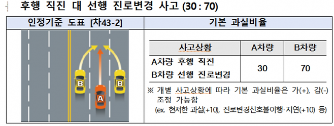 도로에 앞서가다 차로를 변경하는 B차량과 동일방향에서 뒤서오던 A차량이 충돌했을 경우 과실비율은 30(A차량)대 70이 일반적이다. 선행차량은 후행차량과 충분한 거리를 확보하고 위험을 초래하지 않도록 진로변경을 해야 할 의무가 있어 과실이 더 크다. 다만 후행차량도 감속과 제동 등을 통해 사고가 발생하지 않도록 할 주의의무가 있기 때문에 관련 판례 등을 토대로 이런 비율이 정해졌다. 진로변경 신호를 지연 또는 이행하지 않거나, 가까운 거리에서 갑작스럽게 진로를 변경하는 경우 과실비율이 높아질 수 있다. 반드시 진로변경 전 방향지시등을 켜는 습관을 갖고 후행 차량과 충분한 거리가 확보된 상태에서 진로를 변경해야 한다.