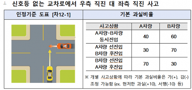 신호등 없는 교차로가 있다. 오른쪽 도로에서 진입해 직진하는 A차량과 왼쪽 도로에서 진입해 직진하는 B차량이 충돌할 경우 누구의 책임이 더 클까. 일반적인 경우 이 사고의 과실비율은 40(A차량)대 60이다. A차량이 먼저 진입했다면 B의 과실은 더 커진다.