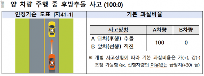 도로를 후행해 진행하는 A차량이 동일방향에서 선행하는 B차량을 추돌했을 경우 과실비율은 100(A차량)대 0이다. 앞차가 이유없이 급정지한 경우(택시 손님을 태우기 위한 급정지나 운전미숙으로 가속기 대신 브레이크를 밟은 경우 등) 브레이크등 고장으로 점등이 되지 않는 경우 앞차량의 과실을 가산(10~30%)할 수 있다. 이에 브레이크등 작동 여부를 주기적으로 확인할 필요가 있다.
