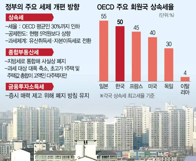 대통령실은 상속세율과 과세 체계, 공제 한도를 포함한 상속세의 전반적 개편을 추진한다. 다음 달 발표될 정부의 세법개정안에 최고 상속세율을 경제협력개발기구(OECD) 평균(26.1%) 수준인 30% 안팎까지 낮추고 상속세 일괄 공제 기준을 현행 5억 원보다 높이는 방안이 담길 것으로 보인다. 성 실장은 “상속세율을 30% 내외까지 인하하는 것이 필요하지 않나 생각한다”고 말했다.