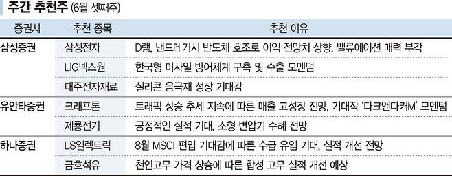 15일 삼성증권은 추천주로 삼성전자를 꼽았다. D램과 낸드 범용 반도체 호조로 이익 전망치가 꾸준히 높아지고 있으며, 글로벌 메모리 반도체 3사 가운데 밸류에이션 매력이 부각되고 있다는 설명이다. LIG넥스원도 추천했다. 삼성증권은 "국내 방산기업들이 보유한 가성비와 납기 능력은 충분히 경쟁력이 있다"며 "특히 한국형 미사일 방어체계 구축과 수출 모멘텀, 고스트로보틱스 인수를 통해 방산로봇기업으로 재평가가 가능한 LIG넥스원에 주목해야 한다"고 말했다.