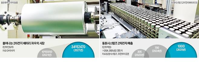 동원시스템즈는 캔·포장재 기술의 미래를 내다보고 2019년 2차전지 케이스 개발에 착수했다. 2021년 원통형 배터리 캔 제조사 엠케이씨(MKC)를 150억원에 인수한 데 이어 2022년 700억원을 들여 충남 아산에 배터리 캔 공장을 증설했다. 캔 참치 안쪽 면에 알루미늄을 고르게 펴는 기술을 토대로 배터리 알루미늄 파우치 사업도 추진 중이다. 동원시스템즈는 2차전지 소재 매출을 작년 305억원에서 올해 700억원, 내년 1000억원으로 키울 계획이다.
