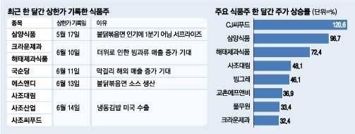 한달간 CJ씨푸드 주가가 120.6% 오른 것을 비롯해 해태제과식품은 72.4%, 빙그레는 46.1% 상승했다. 코스피는 연초 이후 3% 오르는 데 그쳤지만 음식료 업종은 24% 상승했다.