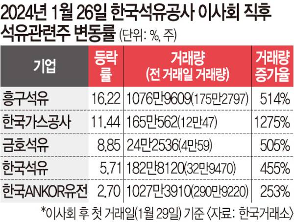 주가 급등 직전 거래일인 1월 26일에는 석유공사가 이사회를 열어 '국내 제8광구 및 제6-1광구 북부지역 탐사시추 추진(안)'을 의결한 것으로 최근 밝혀졌다.