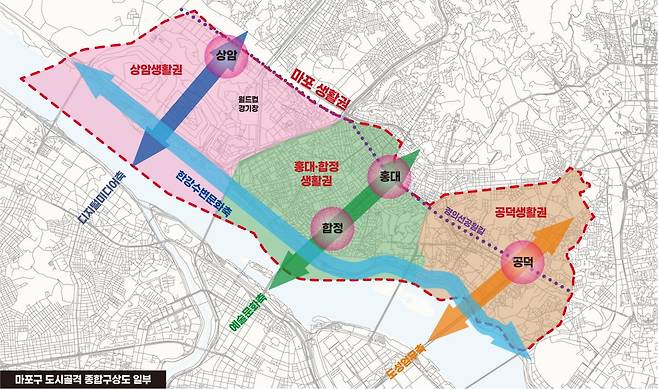 오늘날 마포는 크게 공덕오거리를 중심으로 한 마포대로 일대 동부권과 대학가, 유명 상권이 밀집된 중부, 현재 디지털미디어시티와 월드컵공원이 위치한 서부권 세 곳으로 나뉘게 된다. 이들 지역은 2000년대부터 획기적인 변화를 겪기 시작했다는 공통점이 있다. 각 권역의 성장은 서울 전반의 개발계획, 대중교통 발달과 궤를 같이한다.