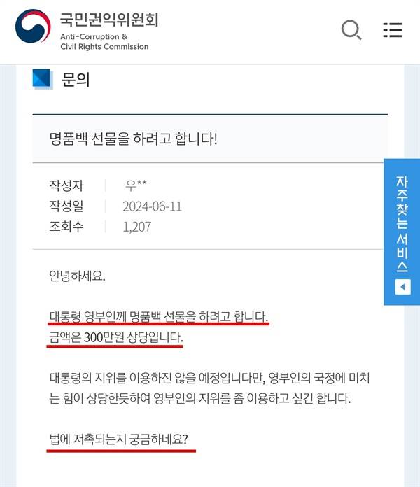 권익위가 명품가방 수수 의혹과 관련해 "대통령 배우자에 대해서는 청탁금지법상 공직자 등의 배우자에 제재 규정이 없기 때문에 종결을 결정했다"라고 발표한 직후에 나온 문의 글이라 답변이 기대되기도 합니다.