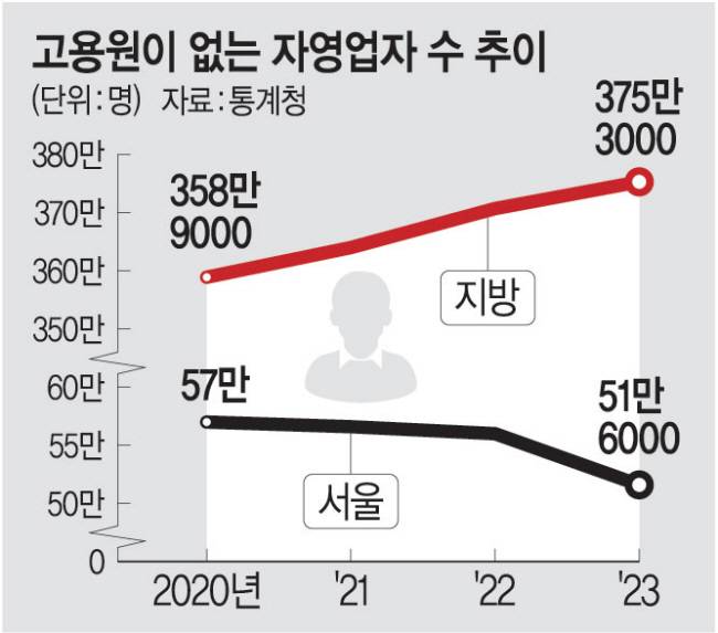 17일 통계청에 따르면 지난해 지방 지역 1인 자영업자 수는 375만3000명으로 2008년 금융위기 이후 15년 만에 최대 수준을 기록했다. 같은 기간 서울권 내 1인 자영업자 수는 71만6000명에서 51만6000명으로 20만 명 감소한 것과 상반된 모습이다. 지방 자영업자들은 지역과 업종에 상관없이 획일적으로 오르는 최저임금으로 인해 전반적인 임금도 매년 상승하면서 직원을 채용하기가 힘들어졌다고 하소연한다. 경남 김해시 주방종합업체 분성그릇의 김선한(52) 대표는 “업종 특성상 몸을 많이 쓰는 일이다 보니 최저임금보다 훨씬 많이 줘야 사람을 구할 수 있다”며 “코로나19 이후 사업도 어려워졌는데 급격한 최저임금 인상으로 임금 눈높이만 높아져 더는 사람을 구할 수가 없다”고 말했다. 결국 높은 인건비 부담으로 1인 자영업을 선택하는 사업주가 늘어날수록 지방 일자리 창출에도 악영향을 끼칠 수 있다. 파이터치연구원이 최근 발표한 보고서에 따르면 최저임금이 20% 인상되면 연간 일자리는 50만8000개 감소하는 것으로 나타났다.
