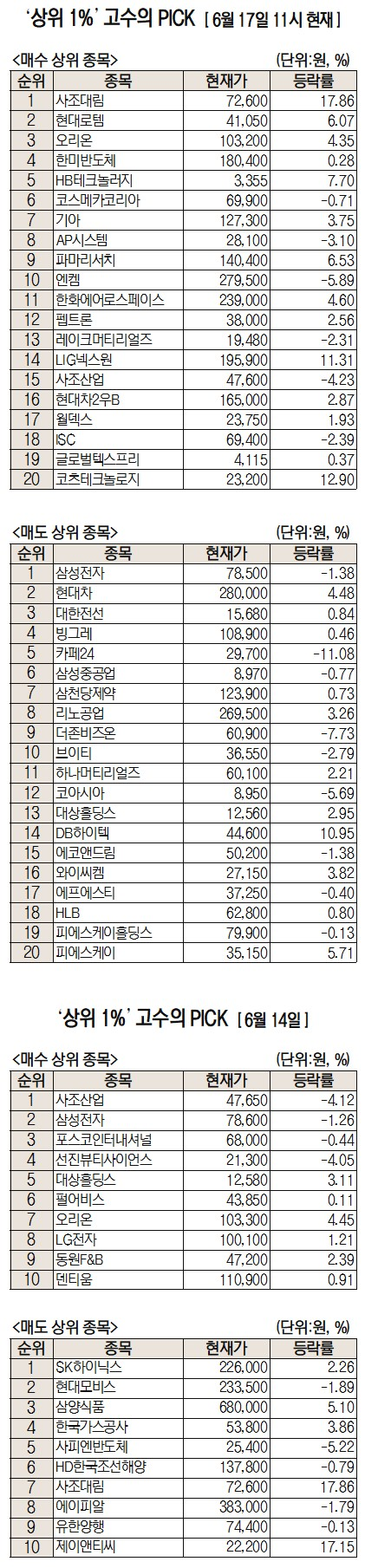 이날 미래에셋증권에 따르면 미래에셋증권 주식 거래 고객 중 최근 1개월 간 투자수익률 상위 1%에 해당하는 '주식 초고수'들이 오전 11시까지 가장 많이 사들인 종목은 사조대림으로 집계됐다.