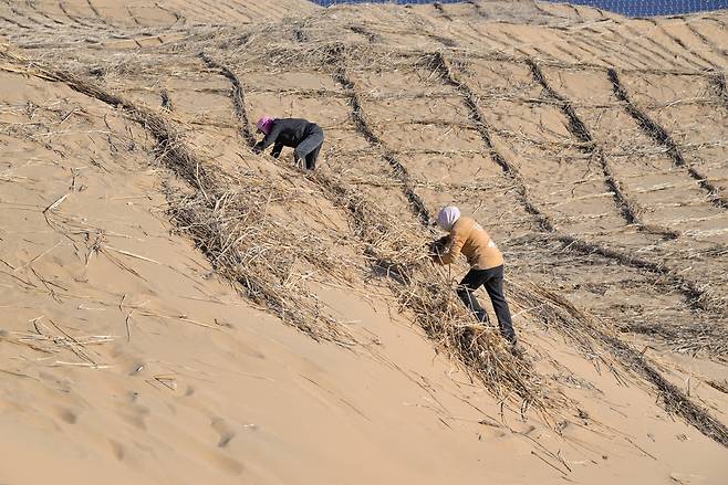 | ▲ 2020년 3월 13일 중국 북부 네이멍구 자치구의 쿠부치 사막에서 노동자들이 사막화를 방지하고 통제하기 위해 모래 장벽을 설치하고 있다. |