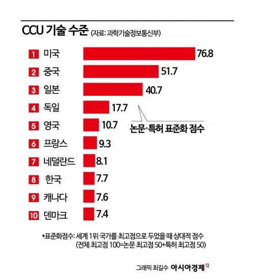 한국은 독일(17.5), 영국(10.7점), 프랑스(9.3점), 네덜란드(8.1점)에 이어 7.7점으로 8위로 평가됐다. 미국, 중국, 일본과는 큰 격차다. 탄소 포집(세계 6위), 탄소 저장(세계 22위) 등 다른 CCUS 기술 수준도 주요국에 비해 상당히 뒤처진 것으로 나타났다.