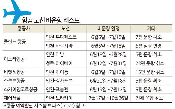 항공업계에 따르면, LOT폴란드항공은 6월6일부터 7월18일 사이에 출발하는 인천-부다페스트 출‧도착 7편과 바르샤바-인천 도착 1편의 운항을 취소했으며, 인천-바르샤바 노선 6편은 운항 스케줄이 변경돼 하루 일찍 출발한다. 이스타항공은 항공기 안전점검을 이유로 6월18일에서 28일 사이 인천-다낭 노선 5편을 비운항하며, 6~7월 청주-타이베이 노선 중 일부 스케줄을 취소했다. 인천-나리타 노선은 7월부터 10월까지 사업 계획 변경으로 주7회에서 주3회로 감편했다. 비엣젯항공은 엔진 리콜 이슈로 기재가 부족해 인천-하이퐁 노선을 6월3일부터 7월16일까지 주7회 운항에서 감편 운항한다. 스쿠트항공도 6월20일~7월18일 기간 운영상의 이유로 인천-싱가포르 노선 운항 규모를 축소했고, 스카이앙코르항공도 6‧7월 인천-프놈펜 노선을 일부 비운항한다. 에어서울은 7월17일부터 10월26일까지 인천-보라카이 노선을 비운항한다. 티웨이항공은 7월12일~23일 사이 청주-돈므앙 노선을 취소했고, 진에어는 6월12일에서 7월15일 사이 인천-방콕 노선의 일부 스케줄을 비운항하며 대체편을 제공했다. 세부퍼시픽항공도 정비를 이유로 9월에 운항하는 인천-세부 노선의 8편을 취소했다.