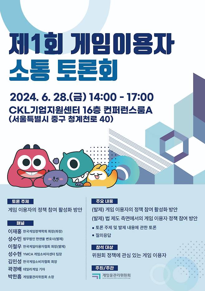 게임물관리위원회(위원장 김규철, 이하 게임위)는 오는 28일 오후 2시부터 서울 CKL기업지원센터에서 '게임이용자의 정책 참여 활성화 방안'을 주제로 '제1회 게임 이용자 소통토론회'를 개최한다고 17일 밝혔다.