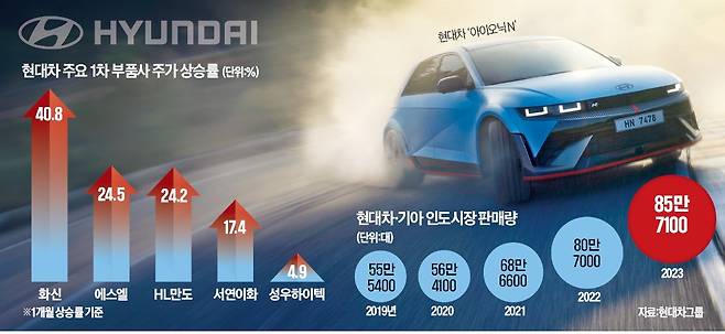 현대자동차 인도 법인의 기업공개(IPO)가 가시화하자 함께 현지 사업을 하는 부품사들의 주가가 급등하고 있다. 인도가 중국과 같은 거대 시장이 될 수 있다는 기대가 자동차 부품주 랠리를 이끌고 있다. 글로벌 톱 완성차 업체로 올라선 현대차·기아의 수익성이 개선되며 부품사도 낙수 효과를 누리고 있다는 분석이 나온다.
