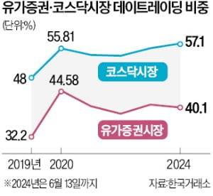 17일 한국거래소에 따르면 올해 들어 이달 13일까지 코스닥시장의 데이트레이딩 거래대금은 630조4839억원으로 집계됐다. 올해 전체 코스닥시장 거래대금(1104조54억원) 가운데 57.11%가 주식을 당일 사고판 거래라는 얘기다. 데이트레이딩 비중은 △2019년 48.00% △2020년 55.81% △2021년 54.08% △2022년 53.85% △2023년 55.87%로 2020년 이후 매년 50%를 넘겼다.