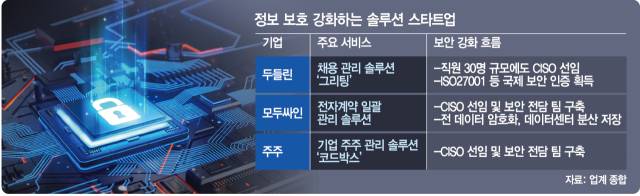 17일 스타트업 업계에 따르면 채용 관리 솔루션을 운영하는 두들린과 전자계약 서비스를 제공하는 모두싸인, 기업 주주 관리 솔루션 운영사 주주는 각각 CISO를 선임하고 보안 전담 팀을 꾸리는 등 개인정보 보호 체계를 강화하고 있다.