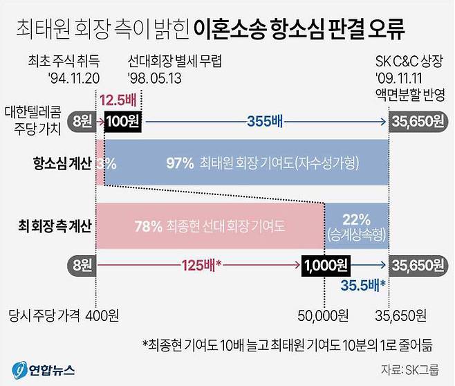 재판부는 이를 바탕으로 1994년부터 최 선대회장 별세까지, 별세 이후부터 2009년 SK C&C 상장까지의 가치 증가분을 비교하면서 회사 성장에 대한 선대회장의 기여 부분을 12.5배로, 최 회장의 기여 부분을 355배로 각각 판단했습니다.