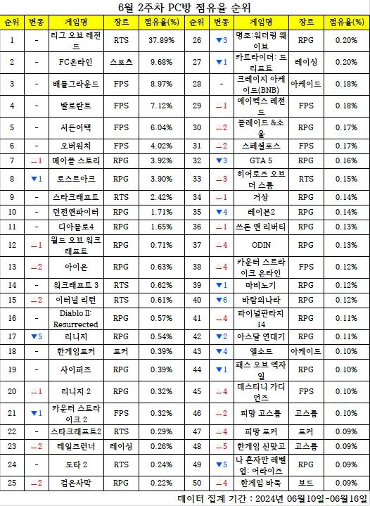 한 주간의 PC방 순위를 되짚어 보고, 어떤 변화가 있었는지 알아보는 'PC방순위' 코너입니다. 데일리게임은 매주 PC방 순위를 일목요연하게 정리, 독자들이 알아보기 쉽도록 제공합니다. 지난 한 주간 어떤 PC 온라인게임들이 눈길을 끌었는지 살펴봤습니다. < 편집자주 >