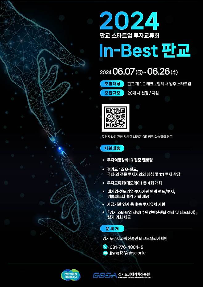 [헤럴드경제(수원)=박정규 기자]경기도경제과학진흥원은 도내 스타트업의 투자 유치와 글로벌 진출을 위해 2024년 판교 스타트업 투자교류회 ‘In-Best 판교’ 참여기업을 오는 26일까지 모집한다고 17일 밝혔다.