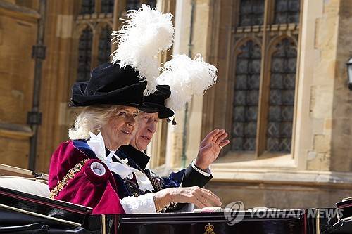 Britain's King Charles III and Queen Camilla waves as they from a carriage after attending the Order of the Garter service, which is held at St George's Chapel at Windsor Castle, in Windsor, England, Monday, June 17, 2024. The Order of the Garter is the oldest and most senior British Order of Chivalry, established by King Edward III nearly 700 years ago. (AP Photo/Kirsty Wigglesworth, Pool) Pool