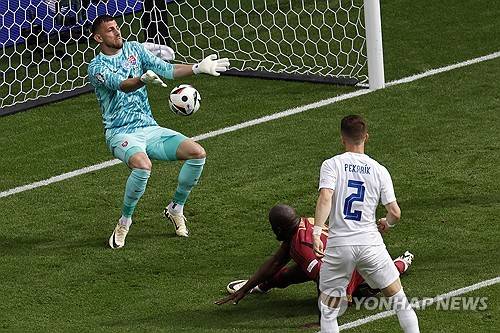 epa11418120 Romelu Lukaku of Belgium (R) in action against goalkeeper Martin Dubravka of Slovakia during the UEFA EURO 2024 group E match between Belgium and Slovakia, in Frankfurt Main, Germany, 17 June 2024. EPA/ROBERT GHEMENT