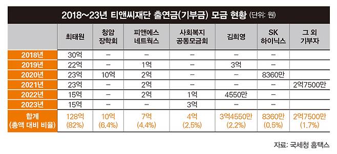 그럼에도 이혼소송 2심 재판부는 티앤씨재단 출연금을 '김 이사장과의 관계 유지 등'에 들어간 돈으로 판단했다. 오롯이 공익 목적으로 티앤씨재단에 사재를 내놓은 건 아니라는 취지다. 김 이사장의 활동 근거지인 티앤씨재단의 재원이 최 회장에 집중돼 있다는 점도 무시하기 힘들다. 2018~23년 티앤씨재단이 받은 기부금은 총 156억원이다. 이 중 최 회장 출연금(128억원)이 82.0%를 차지한다. 그 외의 기부자도 최 회장과 직간접적으로 연결돼 있다.