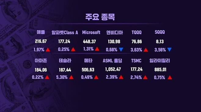 개별 종목들 살펴보면, 애플은 지속적으로 오르고 있습니다. 최근 'AI 폰' 발표가 적어도 애플 기기들의 판매량을 늘리는 사이클을 가져올 수 있을 거라는 기대감이 커지면서 주가가 계속 오르고 있습니다. 테슬라는 5% 넘게 급등했습니다. 중국 정부로부터 상하이 일부 도로에서 완전 자율주행(FSD) 시험 주행을 허가받았다는 호재가 있습니다. 미중 갈등이 첨예한 가운데서도, 중국 정부에 공개적인 구애를 거듭해 온 일론 머스크의 테슬라에 대해서는 중국 정부가 조금씩 나아갈 길을 터주는 모습입니다. 엔비디아는 간밤 0.68% 하락했습니다.