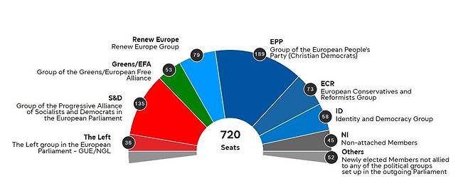 | ▲ 10대(2024-2029) 유럽의회 정당별 의석 분포현황 (출처: European Parliament) |