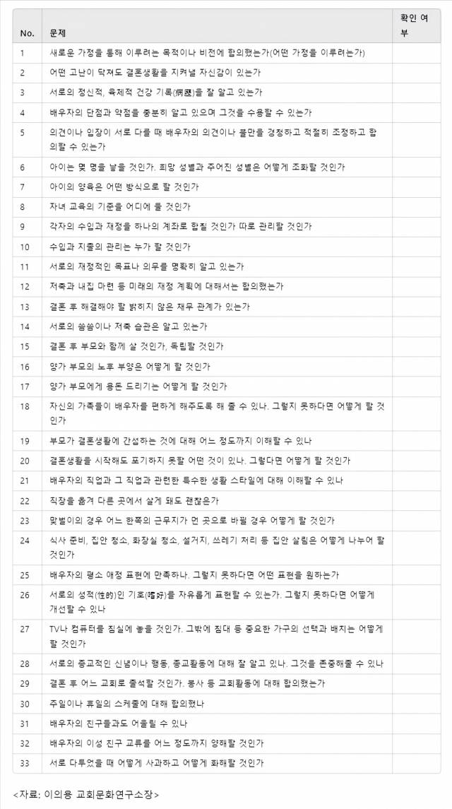 교회문화연구소장인 이의용 전 국민대 교수는 ‘예방주사’를 맞으라고 조언했다. 결혼 전 예비부부가 함께 갈등 예상 문제들을 담은 체크리스트를 풀어보라는 주문이다. 체크리스트에는 ‘배우자의 이성 친구 교류를 어느 정도까지 양해할 것인가’ ‘아이는 몇을 낳을 것인가’ ‘결혼 후 해결해야 할 밝히지 않은 채무 관계가 있는가’ ‘결혼 후 부모와 함께 살 것인가, 독립할 것인가’ 등의 민감한 질문도 적지 않다.