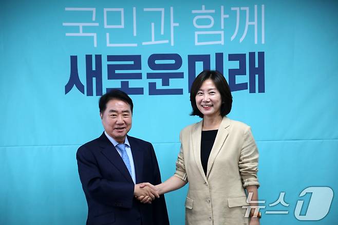(서울=뉴스1) 안은나 기자 = 허은아 개혁신당 대표(오른쪽)가 18일 서울 여의도 새로운미래당사를 찾아 이석현 비상대책위원장과 악수하고 있다. (새로운미래 제공) 2024.6.18/뉴스1