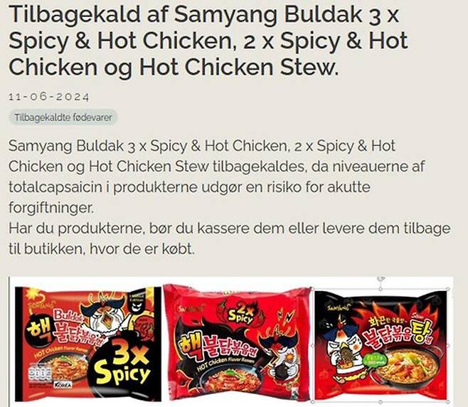 지난 11일(현지시간) 덴마크 수의식품청은 캡사이신 수치가 높아 급성 중독 위험이 있다면서 삼양식품의 핵불닭볶음면 3×스파이시(Spicy), 핵불닭볶음면 2×스파이시(Spicy), 불닭볶음탕면을 현지 시장에서 회수하도록 했습니다.