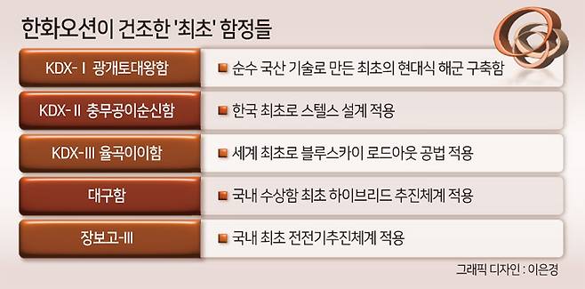 역대 실적만 봐도 ‘최초’란 수식어가 수두룩하다. 말 그대로 한국 해군의 ‘기념비적’ 함정들 대부분이 한화오션의 작품이다. 옛 대우조선해양시절부터 최고 기술력의 ‘함정 명가’로 불린 이유다.