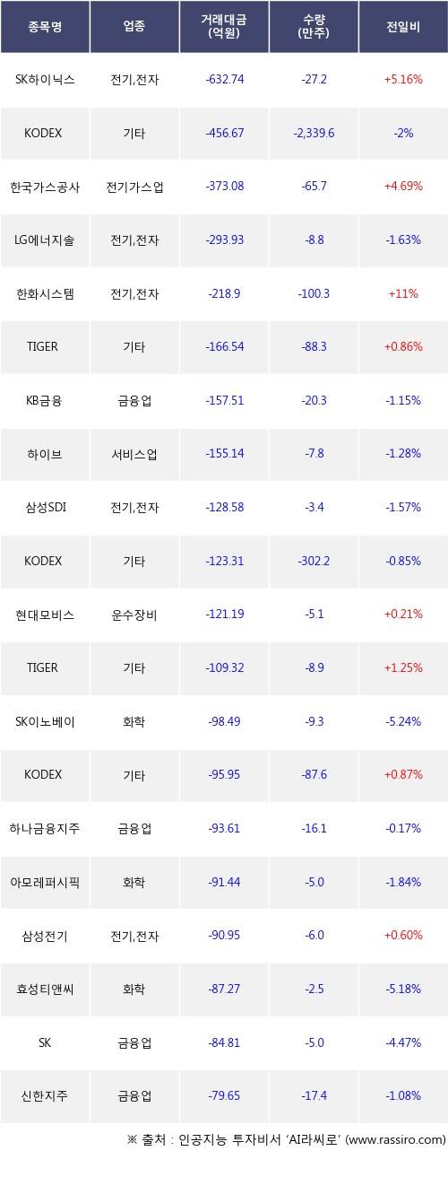 기관 투자자의 순매도 상위 20개 종목은 SK하이닉스, KODEX 200선물인버스2X, 한국가스공사, LG에너지솔루션, 한화시스템, TIGER 미국S&P500, KB금융, 하이브, 삼성SDI, KODEX 인버스등이다.