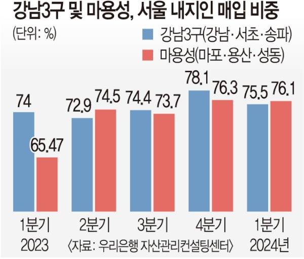 18일 우리은행 자산관리컨설팅센터에 따르면 올해 1분기 서울 거주자의 아파트 매입비중은 마용성이 76.1%로, 강남 3구(75.5%)보다 0.6% 포인트 높은 것으로 나타났다.