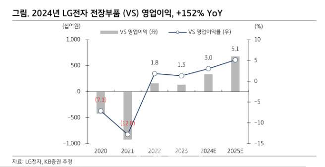 김 연구원은 “2024~2025년 LG전자 전장부품(VS) 실적은 고객 다변화에 따른 수주 증가 효과에 힘입어 매출은 10조원과 13조원을 기록할 것이며 영업이익은 각각 3356억원, 6788억원을 달성할 것”이라면서 “사상 최대 실적이 기대된다”고 말했다.