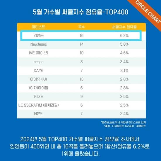 임영웅은 5월 가수별 써클지수 톱 400 점유율 조사에서 400위권 내 총 16곡을 올려놓았다.