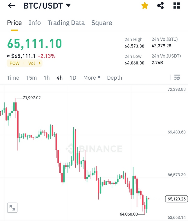 이날도 비트코인은 하락을 거듭해 6만4000달러선까지 밀렸다. 지난달 15일 이후 최저점이다.