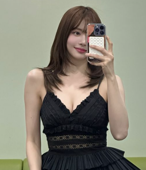 사진 속 한보름은 블랙 미니 원피스를 입고 있으며 얇은 끈으로 어깨를 시원하게 드러냈다.