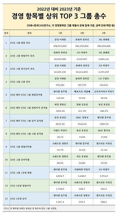 19일 한국CXO연구소가 발표한 '2023년도 그룹 총수 경영 성적 분석' 결과에 따르면, 삼성은 지난해 매출 358조9158억원으로 재계 1위에 올랐다. 이어 현대차(285조2337억원), 최태원 회장이 견인한 SK그룹(200조9307억원) 순으로 집계됐다.