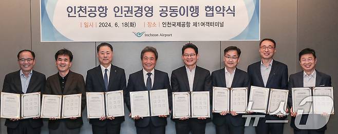 왼쪽부터 안용덕 농림축산검역본부 인천공항지역본부 본부장, 권혁진 서울지방항공청장, 노성재 대한항공 인천여객서비스지점장, 이 사장, 박정원 항공사운영위원회 위원장, 이우상 아시아나항공 인천국제공항서비스지점장, 김종민 인천공항출입국・외국인청장, 윤현덕 국립인천공항검역소장. (인천공항공사 제공) 2024.6.19/뉴스1