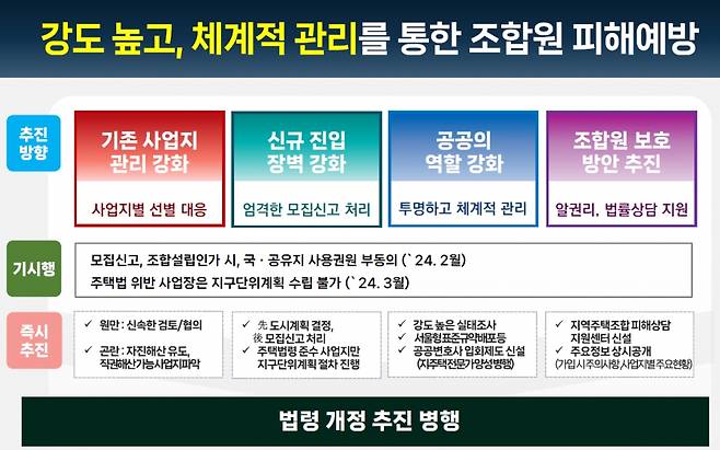 무분별한 사업추진을 막기 위해 신규 지역주택조합 사업 진입요건을 강화한다. 허위 또는 과장된 계획으로 조합원을 모집하지 못하도록 당초에 조합원을 모집한 뒤에 지구단위계획을 수립했던 절차를 개선, 도시계획을 선행하고 모집 신고토록 한다.