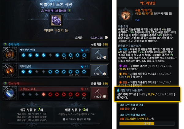아크 패시브를 활성화하면 어빌리티 스톤에 부여된 각인의 성공 횟수에 따라 세공 레벨이 적용된다. 세공 레벨에 따른 새로운 효과도 만나볼 수 있다.
